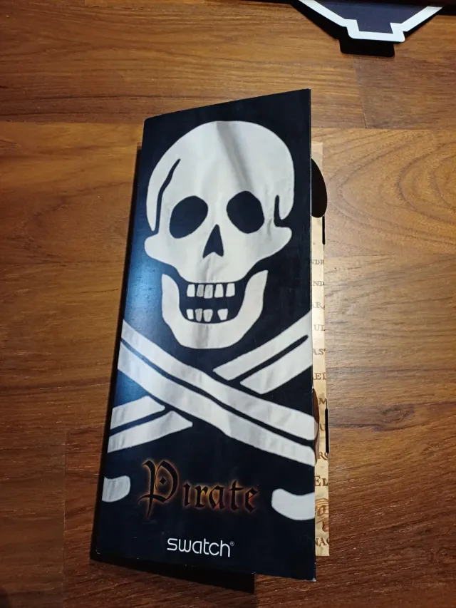 Orologio Swatch con design a tema Pirate. - Teschio e ossa incrociate. - Scritta Pirate in stile calligrafico. - Logo Swatch sul fondo.