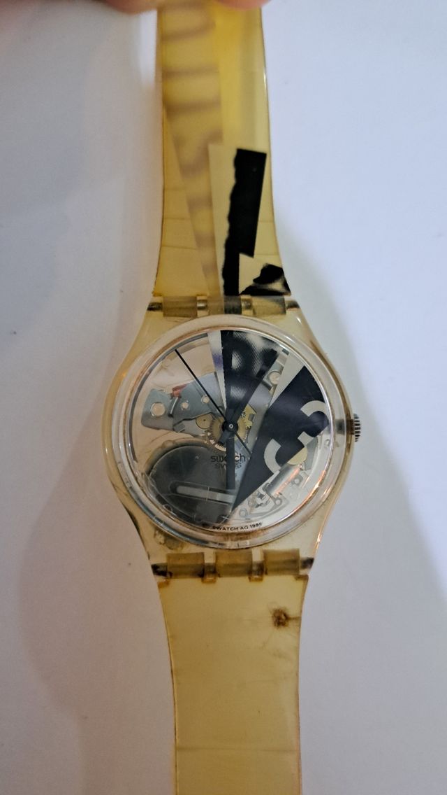Speciale per collezionisti e appassionati del genere : orologio da polso rarità da collezione SWATCH mod. "CON-FUSION GK222" Vintage unisex anno 1996 con motivo B/N su cassa trasparente diam. 34 mm, buone condizioni, inutilizzato da diverso tempo
