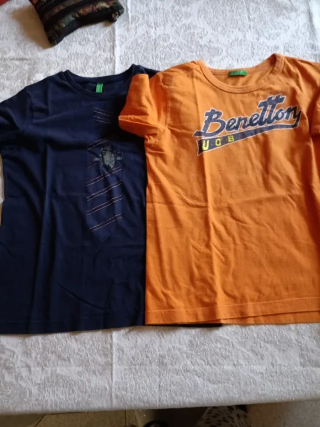 Set di due magliette a maniche corte per bambino. - Una maglietta blu scuro con stampa. - Una maglietta arancione con scritta Benetton UCB.