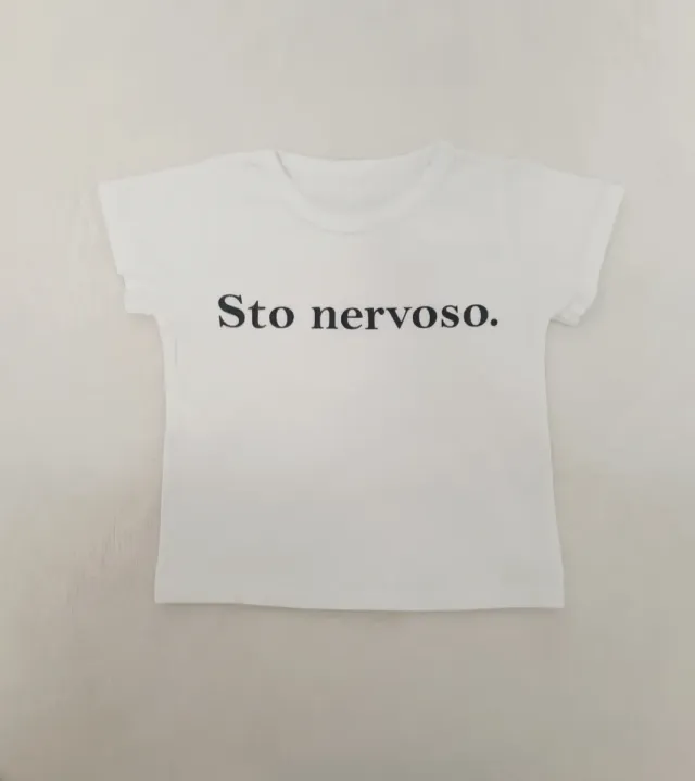 Dettagli del prodottoDeliziosa maglietta bianca per bambino, taglia 9-12 mesi, con la simpatica scritta “Sto nervoso.” stampata sul davanti.