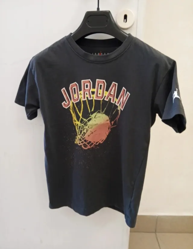 T-shirt Jordan per bambino, ideale per età 10-12 anni. - Taglia indicata: 128-140 cm. - Grafica a tema basket con logo Jordan. Misura spalla a spalla cm 40