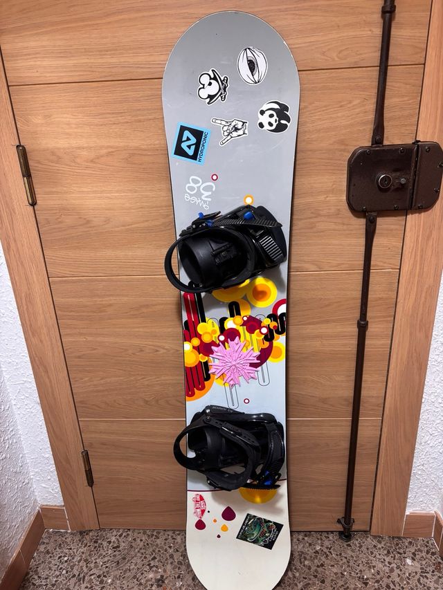 Dettagli del prodottoTavola da snowboard con attacchi inclusi. Pronta per la montagna. Design con varie adesivi. Attacchi neri regolabili. La descrizione è stata tradotta automaticamente.