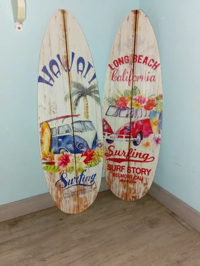 Dettagli del prodottoDue tavole da surf decorative in stile vintage e da spiaggia. Perfetto per dare un tocco estivo a qualsiasi spazio.