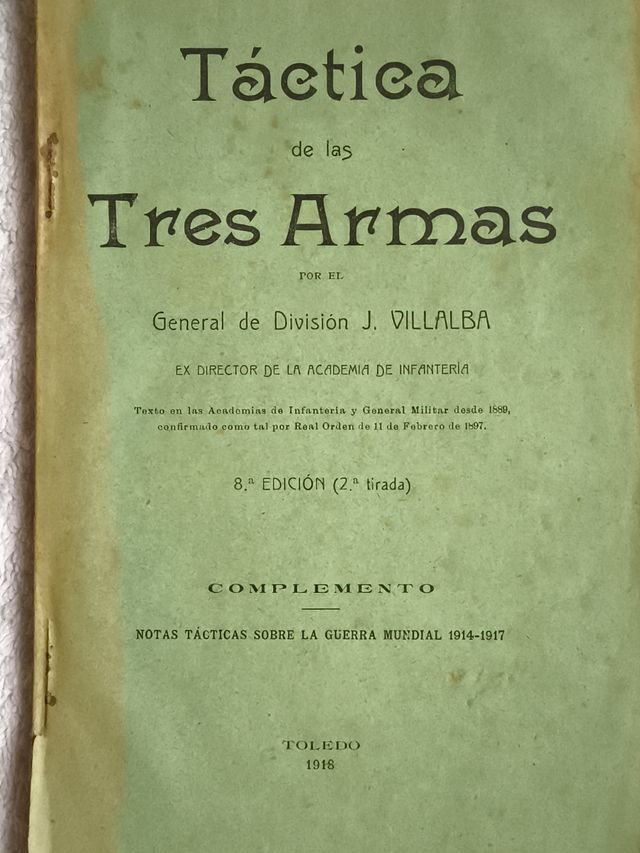 Dettagli del prodottoTactica de las Tres Armas sulla guerra mondiale 1914-1917, è il testo utilizzato nelle Accademie di Fanteria di Toledo nel 1918 per aspiranti ufficiali militari. Include un paio di mappe e schizzi sulla posizione tedesca del mulino di Laffeux e un'altra sui campi di battaglia della Marna, che si sono deteriorati perché doppi e protettivi. In generale, l'interno è in buone condizioni e rilegato in una copertina morbida con una graffetta dell'epoca. Ben conservato e con tutte le sue foglie. Molto interessante da leggere per la sua età e ideale per gli amanti o i collezionisti della Guerra Mondiale.