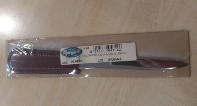 Tagliacarte Munari con fodero in pelle marrone. - Modello: 15AVANA - Articolo: 06.0818 - Materiale lama: Nichel Teolo