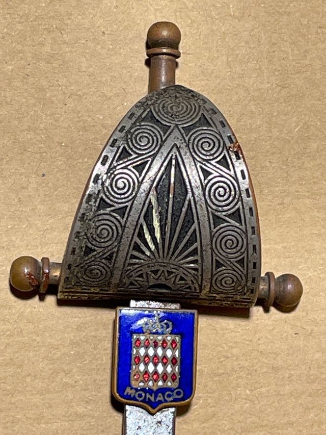 Dettagli del prodottoElegante tagliacarte a forma di spada, con dettagli che richiamano il Principato di Monaco. Anni 50
