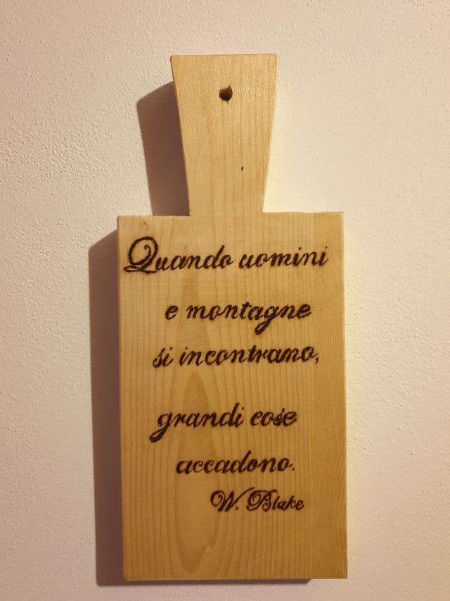 Dettagli del prodottoTagliere decorativo pirografato a mano con aforisma sulla montagna di W. Blake; misure 14 cm x 31 cm. Ottima idea regalo per amanti della montagna o per case di montagna. Possibilità di crearne di personalizzati.