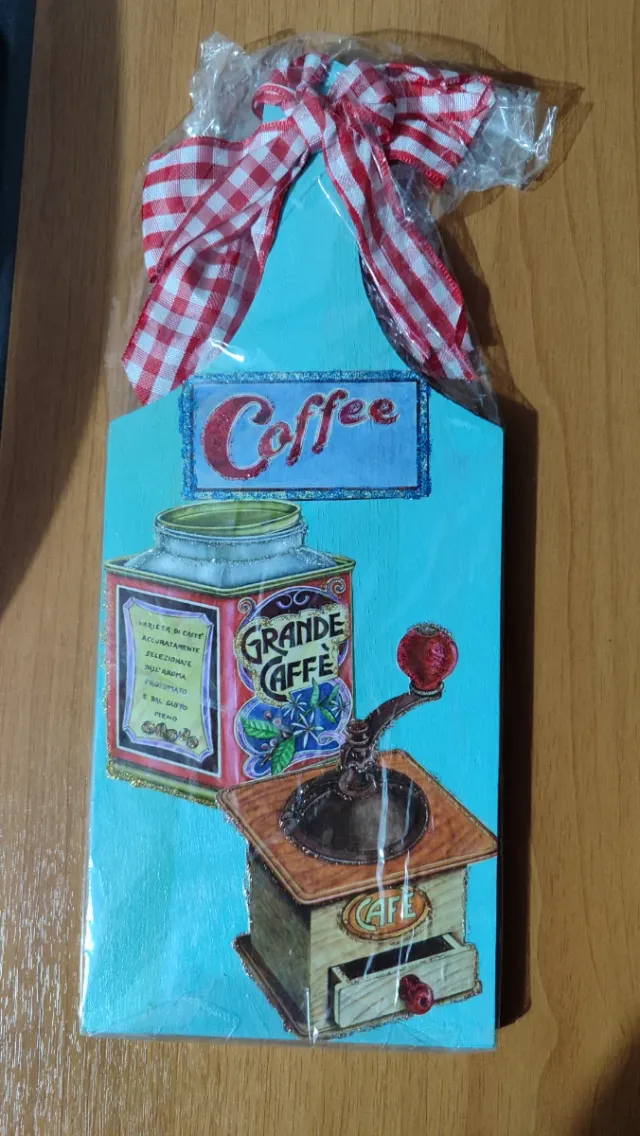 Dettagli del prodottoBellissimo tagliere in legno decorato a mano con tecnica decoupage, a tema Coffee.