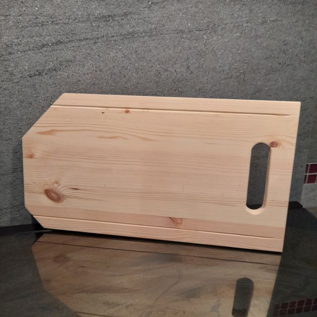 Dettagli del prodottotagliere in legno listellare di abete, autoprodotto,misure 46x25 con spessore 22 mm....lavorazione manuale, ritagliato da pezzi di scarto della lavorazione del legno...idea regalo per Natale, possibilità di usarlo come supporto per il classico cesto natalizio