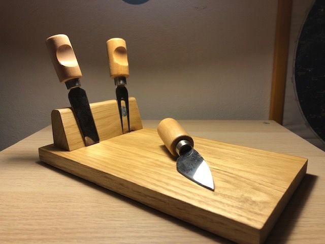 tagliere per formaggi nuovo mai usato, con calamite per i suoi coltelli, tre coltelli per formaggi compresi nel set