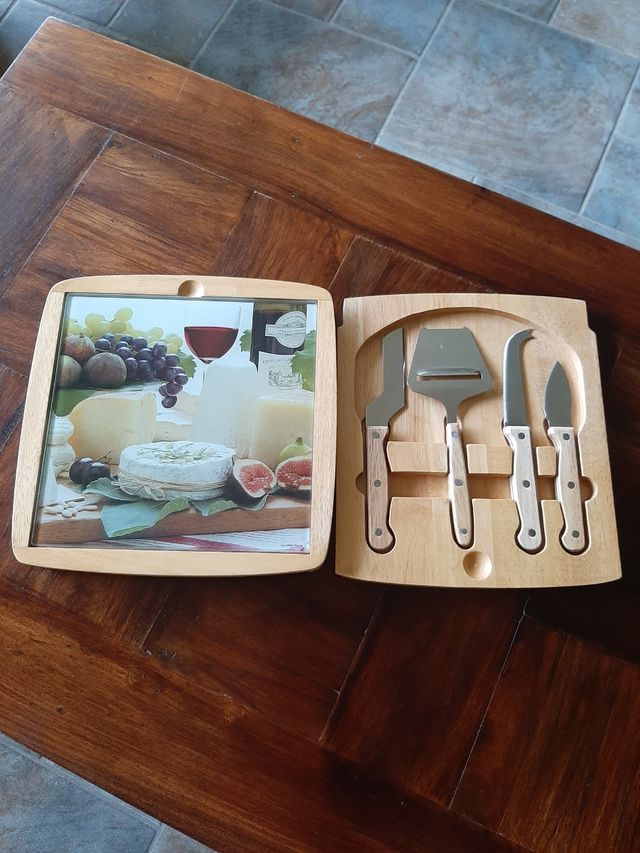 Dettagli del prodottoTagliere per formaggi in legno con cassetto estraibile con 4 coltelli da formaggio con manico in legno. Usato una volta. Ancora nella scatola originale. Misure del prodotto