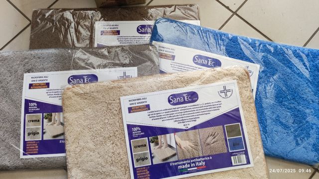 Dettagli del prodottoVendo tappetini bagno SanaTec, in microfibra con ioni d'argento. Sono morbidi e comodi. Misurano 45x70 cm. - Antibatterici e autopulenti. - Disponibili nei colori crema, grigio,tortora e blu. - 100% microfibra, eco-biodegradabile. - L'efficacia antibatterica rimane anche dopo numerosi lavaggi.