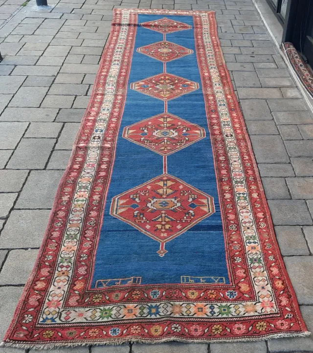 Tappeto persiano antico Runner Blu e Rosso in Lan