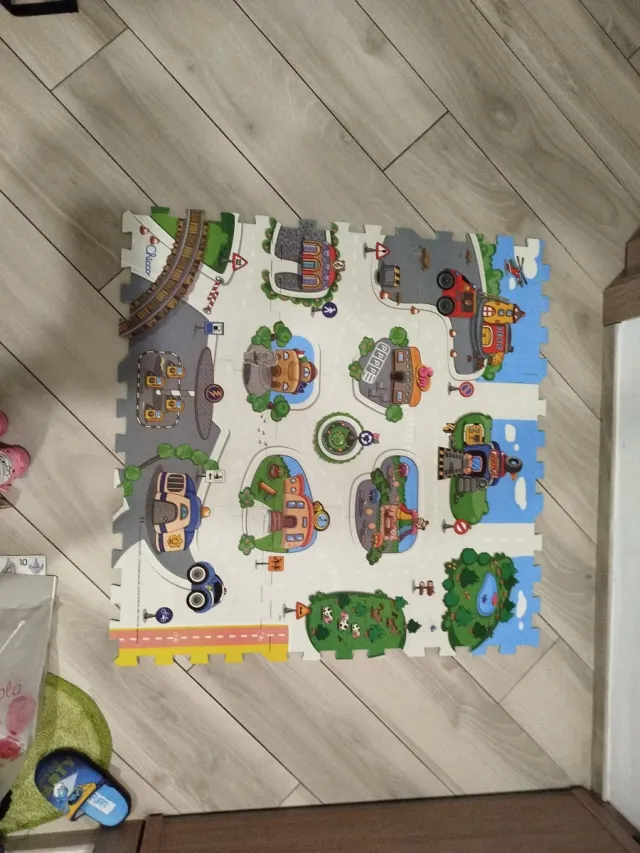 Tappeto gioco per bambini con disegno di una città e strade. - Pezzi componibili. - Design colorato con veicoli e case. - Ideale per creare un'area gioco.