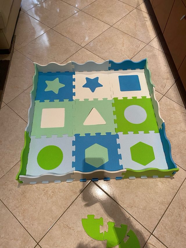 Dettagli del prodottoTappeto gioco composto da diversi pannelli puzzle con forme geometriche.