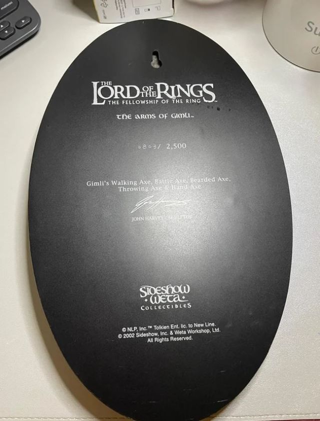 Dettagli del prodottoQuesta bellissima collezione è montata in modo permanente su una targa ovale nera con la mappa della Terra di Mezzo incisa sulla sua superficie. Il retro della targa riporta il logo del film, i nomi delle armi e le firme degli scultori delle armi. Ha un certificato stampato che evidenzia i nomi delle armi. Scala 1:4 Da collezione artigianale Edizione limitata di soli 2500 esemplari in tutto il mondo Prodotto con licenza ufficiale Di Sideshow Weta