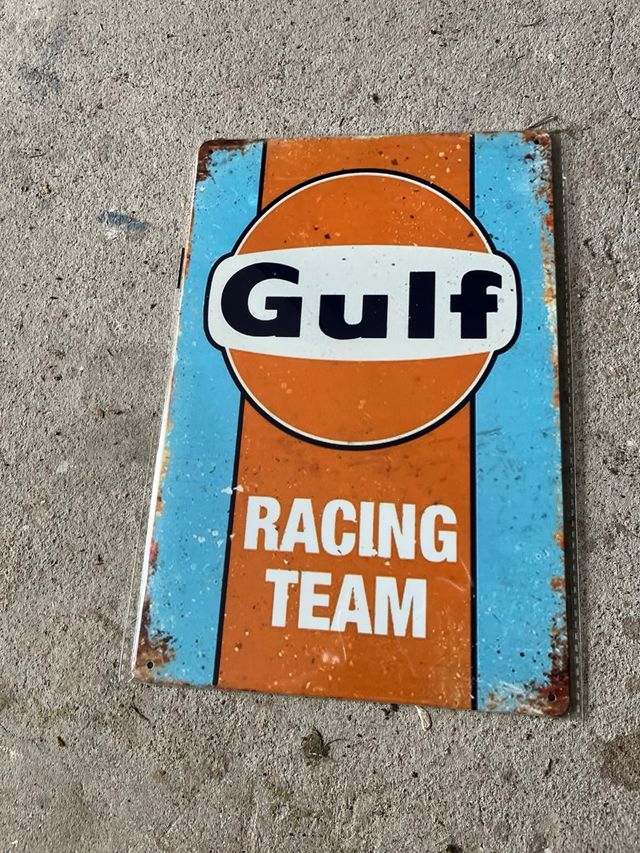 vendesi targa vintage Gulf Racing Team in latta , nuova , dimensikni 20,32 x 30,48