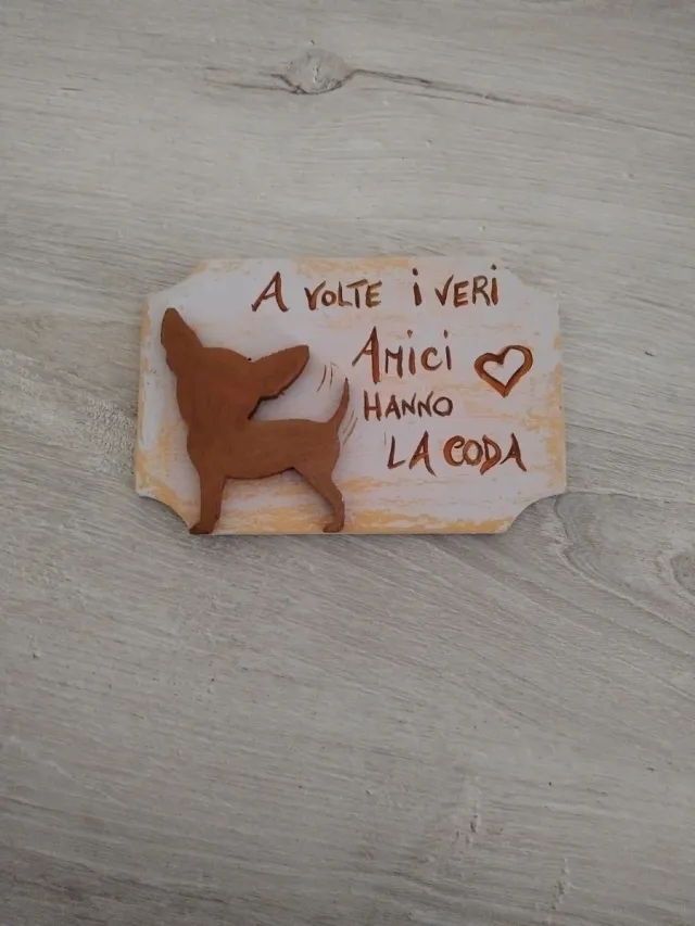 Dettagli del prodottoTarghetta decorativa con una simpatica frase. Articolo artigianale dipinto a mano.