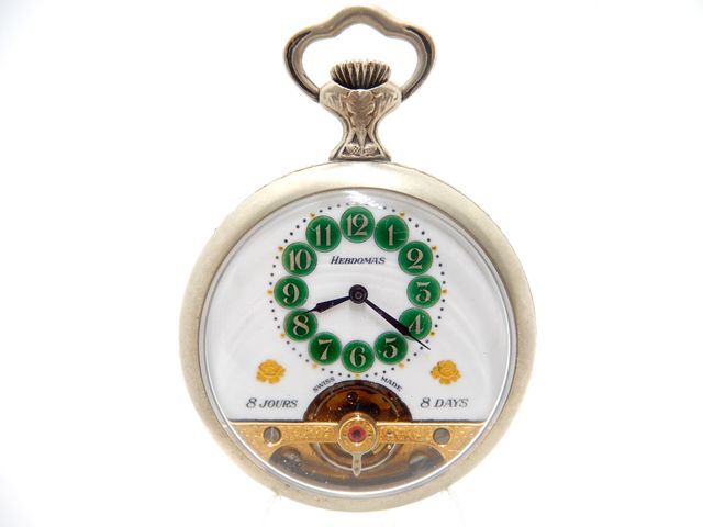 Dettagli del prodottoAntico orologio da tasca 8 giorni HEBDOMAS con ottimo quadrante in ceramica a CARTOUCHE verde marcato Hebdomas . Movimento meccanico a carica manuale . Barilotto portamolla lavorato con medaglie incise . Splendida cassa cesellata con scena di caccia in rilievo sul retro . Diametro cassa mm 50 . L'orologio e' in ottime condizioni e funzionante .