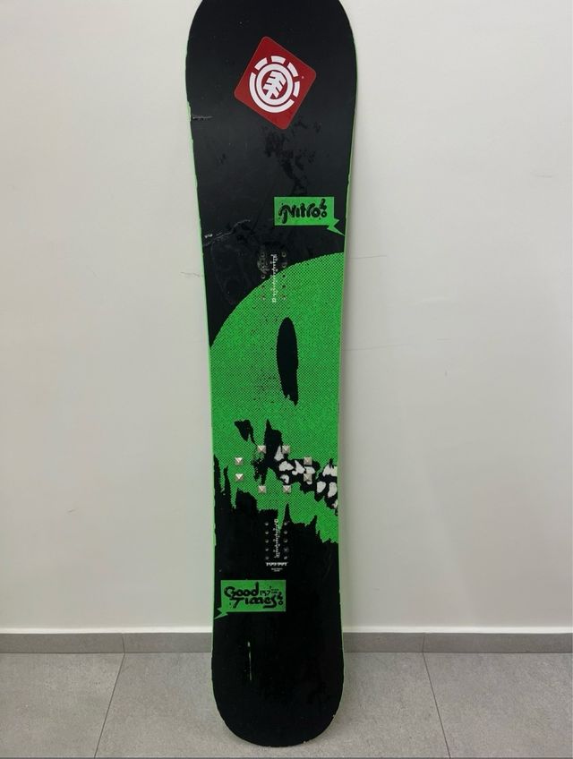 Tavola da snowboard Nitro, modello 157. - Design con grafica verde e nera. - Logo Element in alto. - Scritta Nitro e Good Vibes visibili.