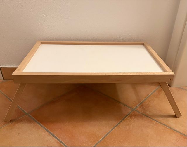 Pratico tavolinetto in legno, ideale per servire la colazione a letto o come supporto. - Struttura in legno chiaro. - Piano bianco.