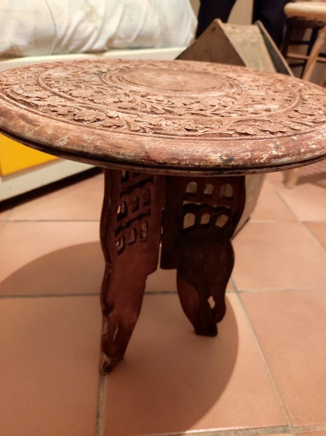 tavolino etnico in legno tutto intarsiato a mano. la parte superiore è scolorita.