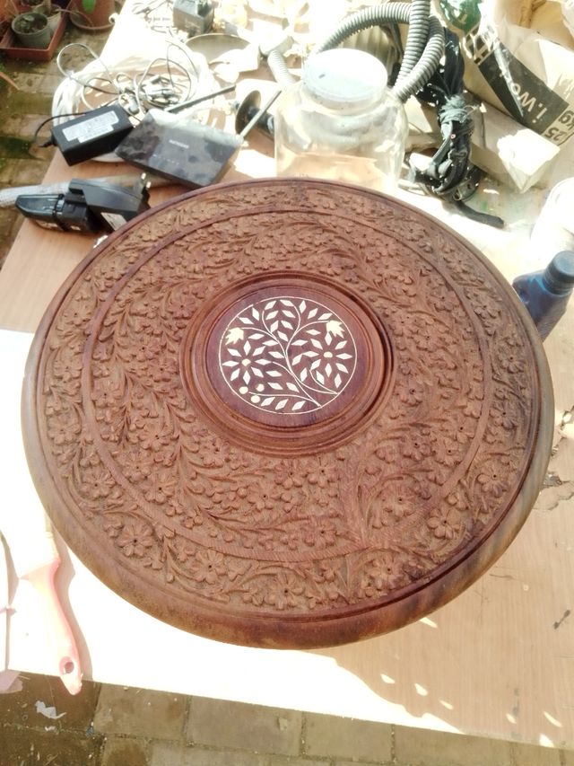 Tavolino intagliato a mano con inserti dosso dimen
