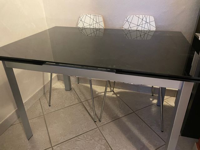 Dettagli del prodottoVendo tavolo con piano in vetro temperato laccato nero e struttura in metallo grigia di misure: 120x83, possibilità di estenderlo