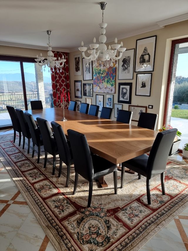 Dettagli del prodottotavolo in legno su misura, sedie in ecopelle nera
