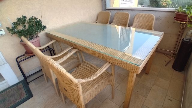 Dettagli del prodottovendo set da giardino composto da tavolo in vetro e polirattan 180x96 +5 sedie con braccioli beige marca Harbo a Brescia e provincia Misure del prodotto