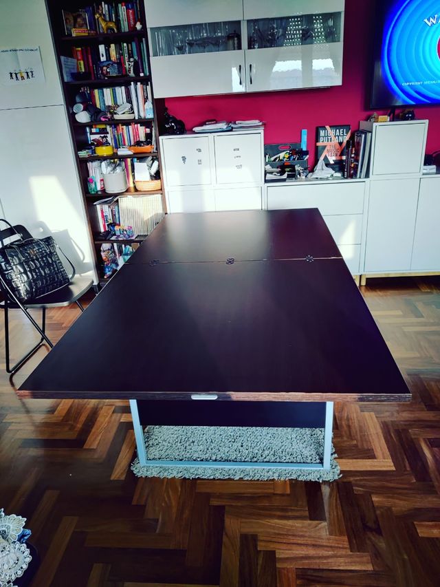 Vendo tavolo multifunzione pieghevole in legno e acciaio Da aperto: 8 persone sedute comodamente Misure da chiuso 90x90 h43 Misure da aperto 180x90 h75