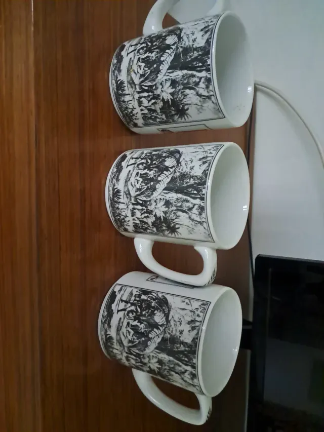 Dettagli del prodottoSet di tre tazze di porcellana con design vintage. Design dettagliato in bianco e nero. Materiale: porcellana. La descrizione è stata tradotta automaticamente.