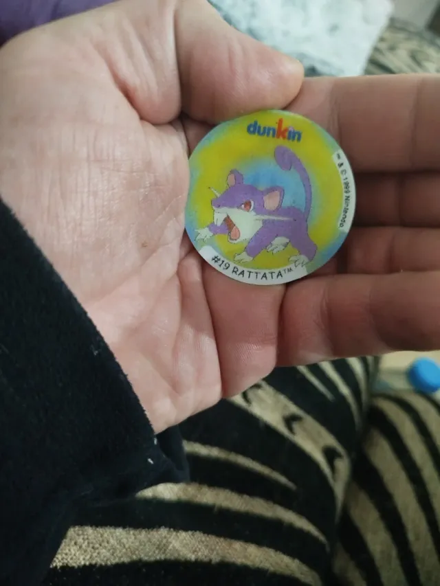 Dettagli del prodottoCollezionista Tazo di Dunkin con il Pokémon Rattata, numero 19. Design circolare con illustrazione di Rattata. Logo di Dunkin visibile. Include numero di Pokémon e nome. Copyright 1999 Nintendo. La descrizione è stata tradotta automaticamente.