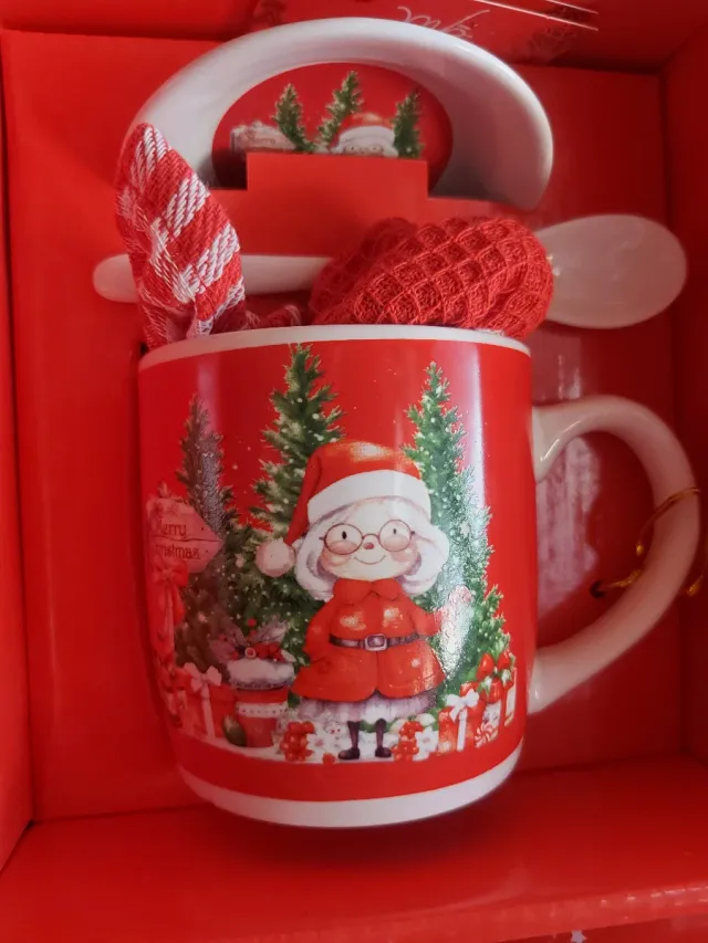 Dettagli del prodottoSet tazza natalizia con decorazione di Babbo Natale e alberi.