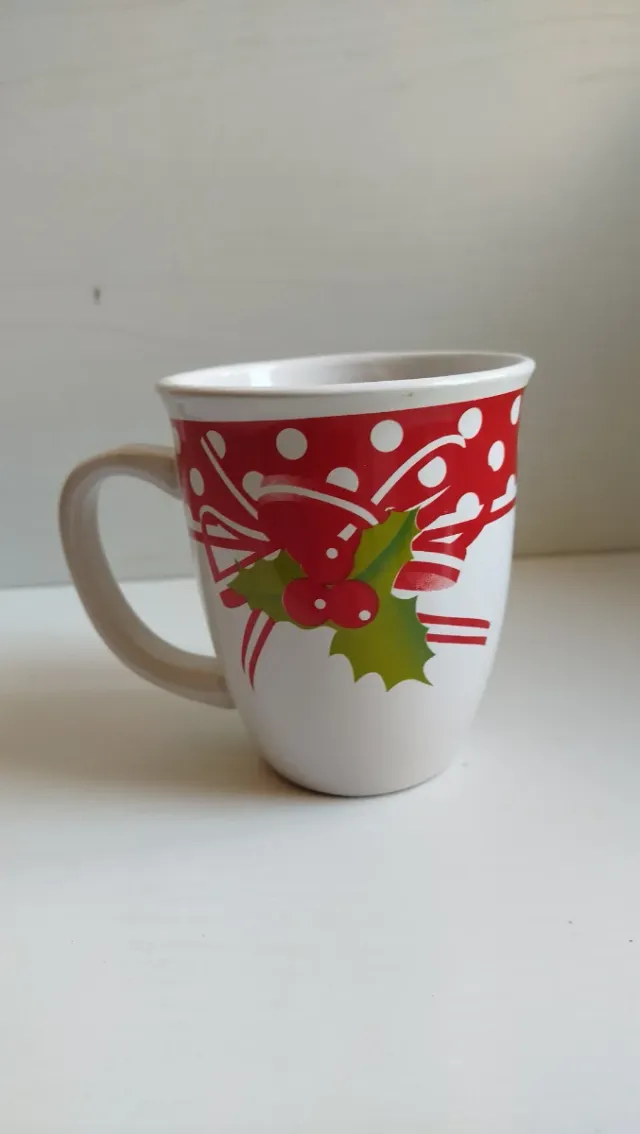Tazza in ceramica con un allegro design natalizio. - Decorazione a pois bianchi su sfondo rosso. - Motivo con fiocco, agrifoglio e bacche rosse.