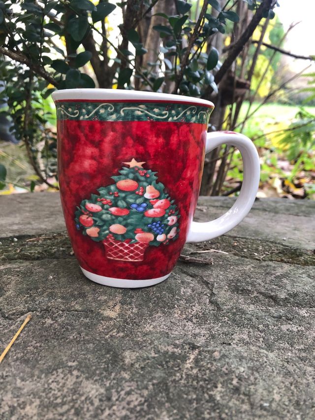 Tazza con un allegro design natalizio, perfetta per le festività. - Decorazione con albero di Natale e frutti. - Bordatura superiore con motivo verde e bianco.