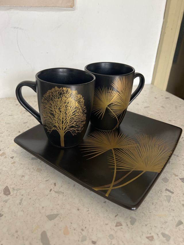 Dettagli del prodottobellissime tazze nero opaco con decorazione in foglia oro e piattino coordinato , mai usate in perfette condizioni! Misure del prodotto