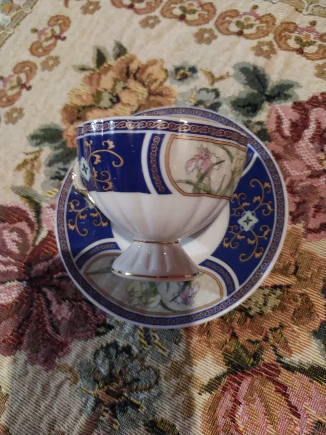 Dettagli del prodottoElegante tazzina da caffè vintage con il suo piattino abbinato, parte della collezione Galaxy. Il design presenta un motivo floreale delicato su sfondo blu e bianco, con dettagli dorati che aggiungono un tocco di raffinatezza.
