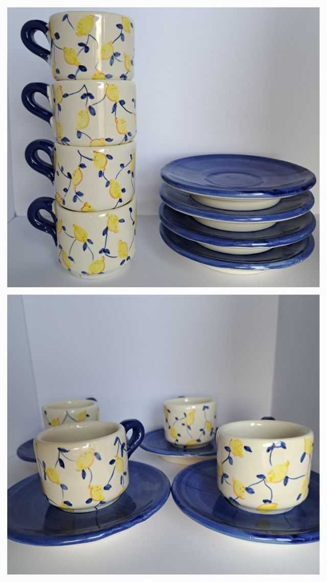 Dettagli del prodottoSet 4 tazzine da caffè in ceramica decorate a mano con fantasia a limoni. Prodotto artigianale