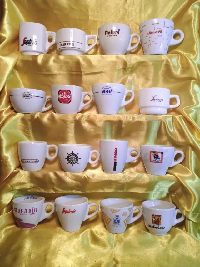 Lotto 023 Set di 16 tazzine da caffè pubblicitarie, senza piattini inperfette condizioni, come da foto,per collezionisti o per chi ama il design