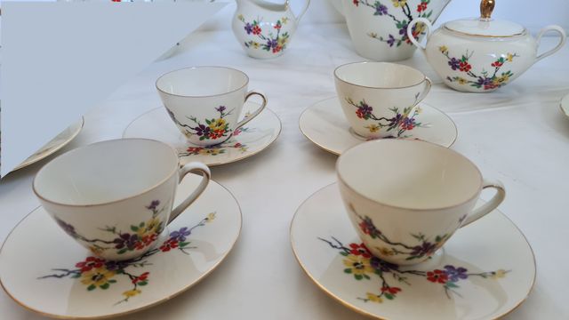 Dettagli del prodottoServizio vintage di 4 tazzine da caffè con piattini, caffettiera, lattiera e zuccheriera Seltmann Weiden Bavaria, con rami di fiori colorati e bordo dorato.