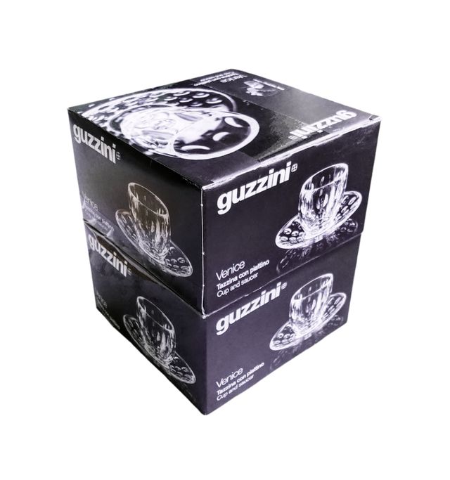 Dettagli del prodottoSet di 2 tazzine/bicchierini da caffè in vetro della linea Guzzini Venice, senza manico, con piattino in SMMA abbinato; colore neutro trasparente con motivo "dots" a rilievo. Articolo nuovo, mai usato e nella confezione originale. PREZZO NON TRATTABILE.