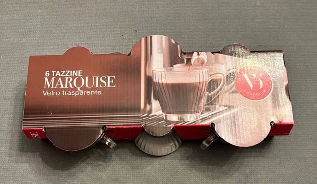 Sei tazzine da caffè in vetro trasparente lavorato, nuove ancora incartate.