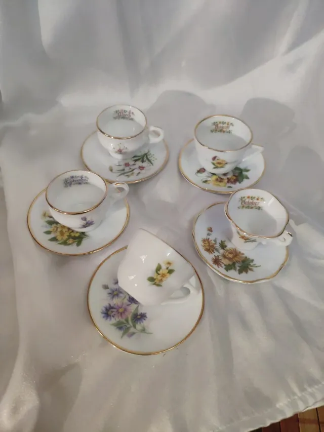 Dettagli del prodottoSet di 5 tazzine da caffè in miniatura con piattini, della collezione Old England Imperial Lily. Ogni tazzina e piattino presenta una decorazione floreale diversa, con bordi dorati e 5 diversi mesi, prezzo intero set € 45, € 10 singola.