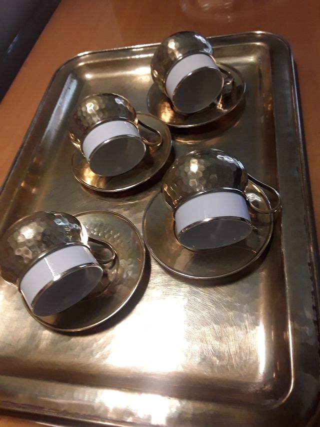 4 tazzine in Ceramica ,con porta tazzine e piattino in Ottone con punzonatura +Vassoio
