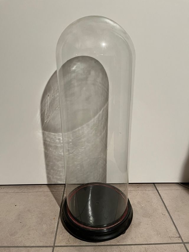 Dettagli del prodottoVendo teca in vetro a forma cilindrica con cupola rotonda nella parte terminale e base in legno.