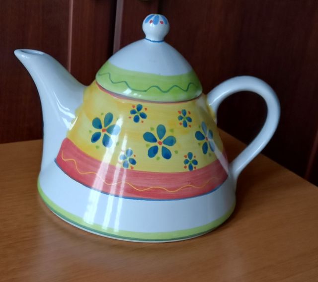 graziosa e capiente teiera decorata con fantasie primaverili. Dimensioni circa 17x22 cm.