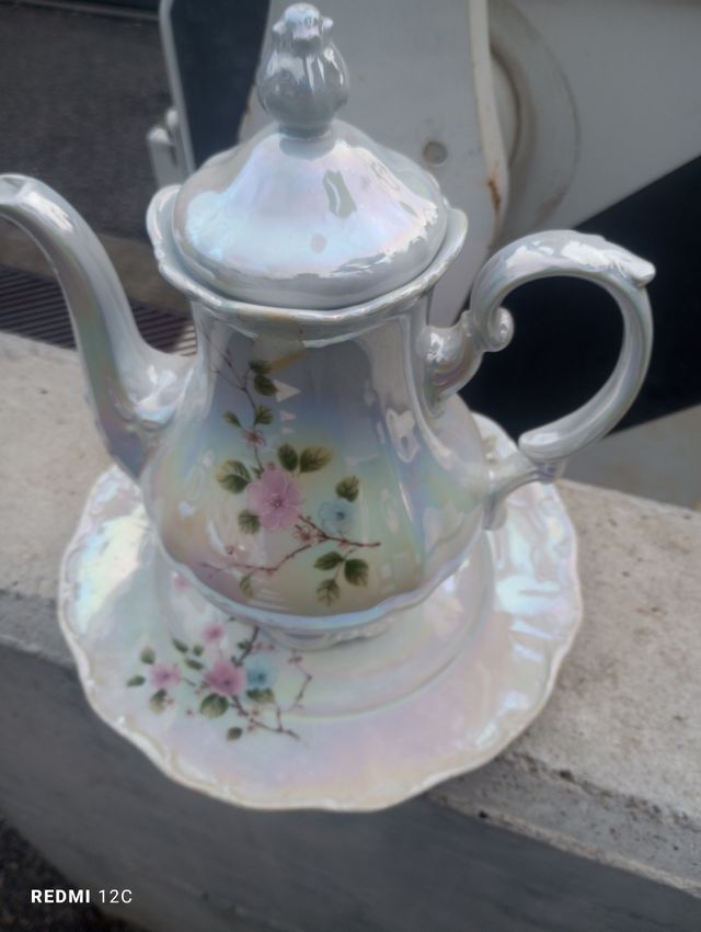 Dettagli del prodottoElegante teiera Baviera con piattino abbinato, caratterizzata da una finitura iridescente e decorazioni floreali.