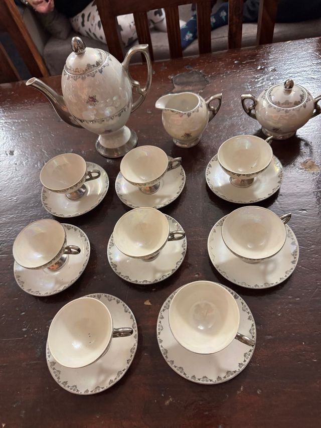 Dettagli del prodottoElegante servizio da tè in porcellana con finiture perlate e argentate. Un set raffinato per i tuoi momenti speciali.