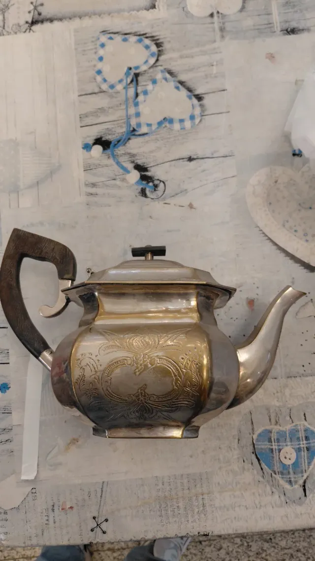 Dettagli del prodottoElegante teiera in metallo argentato, con manico in legno scuro e dettagli finemente incisi.